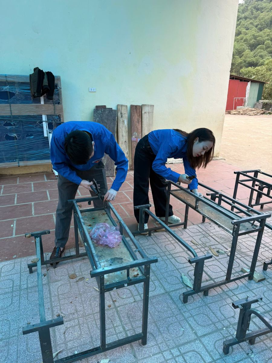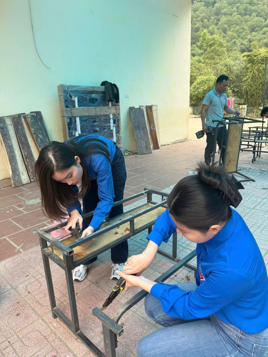 Đoàn viên Chi đoàn Sở Tư pháp hỗ trợ công tác sửa chữa bàn học